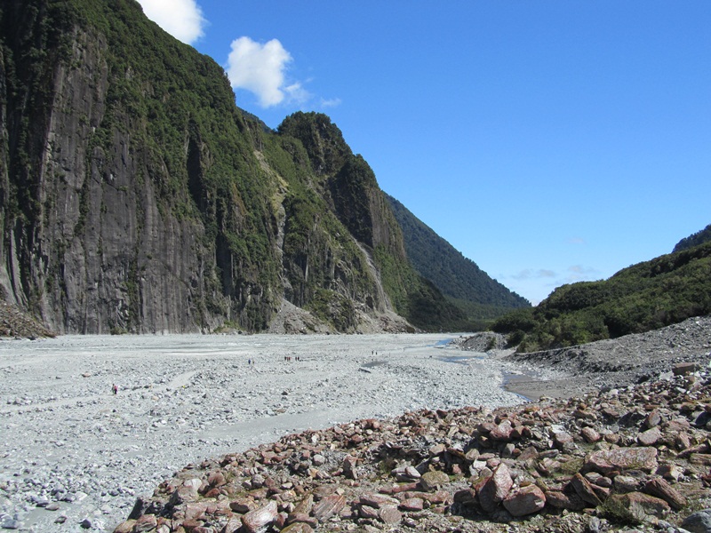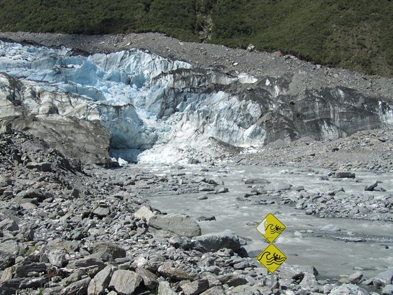 Diese beiden berühmten Gletscher haben eines gemeinsam: sie kommen mit ihren Gletscherzungen fast auf Meereshöhe herunter. Auf relativ kurzen Wegen, mal eineinhalb Stunden durch den z.Zt.  leeren Gletschersee des Franz Josef Glacier, mal eine Stunde am Gletscherfluss entlang des Fox Glacier  braucht es, um ganz nah heranzukommen. Es ist gigantisch. Du läufst im T-Shirt und kurzen Hosen zu diesem Eisriesen hin, auf dem Seilschaften mit Eispickeln unterwegs sind. Der Fox Glacier ist 2,5km lang und glitzert an einer Stelle, die frisch auseinandergebrochen ist, weiß und strahlend in der Sonne.