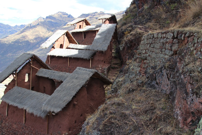 Da wir keine Wohnhäuser mit Dach zu sehen bekamen, stellen wir euch als Beispiel mal ein Foto von den unglaublich interessanten „Speisekammern“ von Pisac ein. Sie wurden (natürlich nicht nur hier) immer an dem Steilhang errichtet, an dem Aufwinde vorhanden sind, damit ein ständiger Wind die eingelagerten Waren kühlt. In dieser Weise funktionierte wohl auch die „Klima-Anlage“ in den Wohnhäusern.