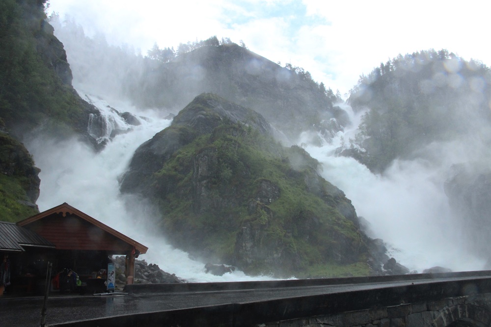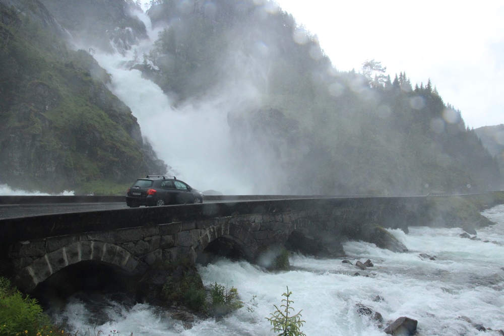 Die vielen weiteren Wasserfälle, die uns auf diesen Fahrten begegnen, möchten wir euch, obwohl immer wieder beeindruckend, ersparen, nicht dass Langeweile aufkommt! Na gut, bis auf Einen! Da müsst ihr nochmal durch. Den ganz besonders zu erwähnenden Zwillingswasserfall Latefoss, der aufgrund der zurzeit üppigen Wassermengen ganz besonders wild ist und dessen Fotos unweigerlich hier in unseren Blog gehören! Die Gischt dieses, durch einen Felsvorsprung in zwei geteilten, den Berg hinabstürzenden Wasserfälle, ist so stark, dass wir uns nur mit Regenbekleidung nähern können und die Linse der Kamera leider sofort „tropft“. Die auf dem Foto erkennbare Brücke muss im Anschluss von uns überquert werden! Eine Autowäsche gratis!