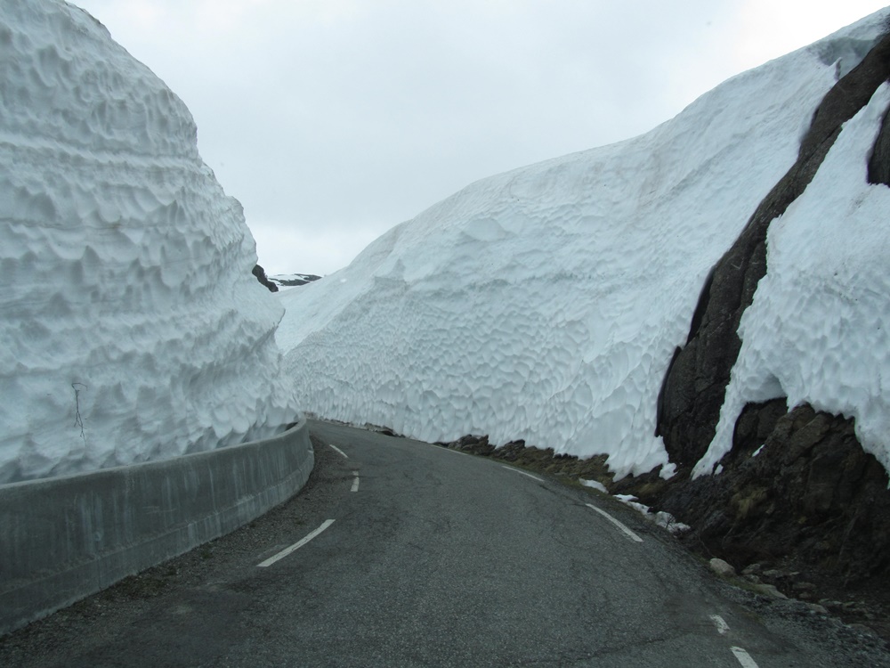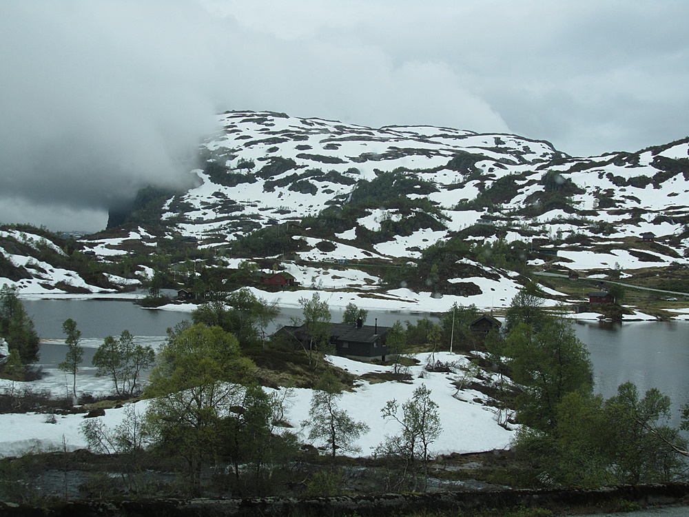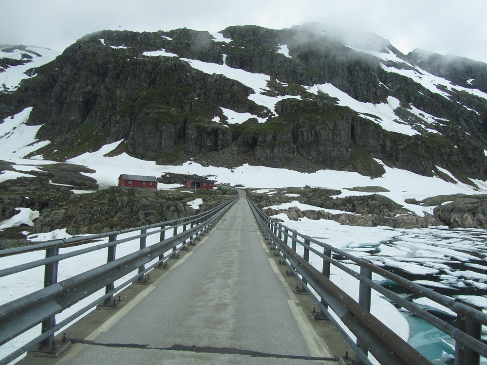 Unterwegs zu unserem nächsten Ziel, dem berühmten, massiv im Lysefjord stehenden Felsen Preikestolen haben wir wiederum die als ‚besonders schön‘ markierten Straßen gewählt – und kommen somit immer wieder über Pässe – und immer wieder von 0 m auf 1000 m oder drüber. Und unweigerlich und überraschend landen wir auch immer wieder in Schnee und Eis! Faszinierend!