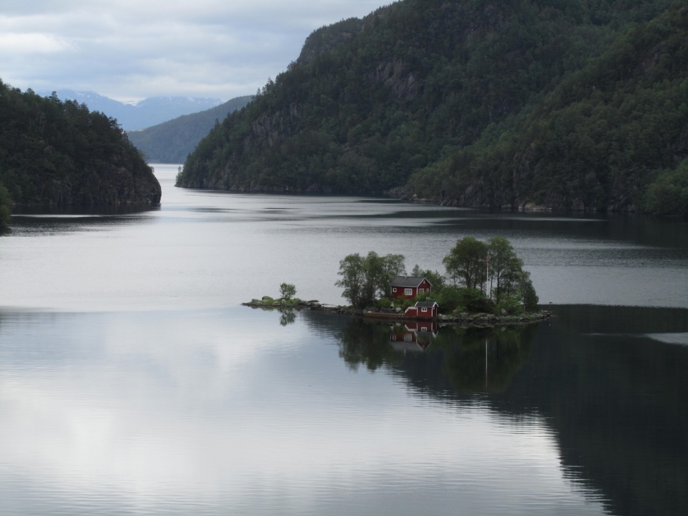 Ein tolles Bild haben wir übrigens Pauls Intuition zu verdanken. Wir fahren so gedankenverloren an einem Fjord entlang, Paul fährt, ich halte die Kamera gezückt, als er plötzlich ruft: diese kleine Insel dort unten haben wir vor neun Jahren fotografiert und das Bild ist in unserem Reiseführer drin! Sofort leiere ich das Fenster runter, er bremst ab, ich halte drauf und ergattere das nachfolgende Foto, welches alle, die unseren Nordlandreiseführer zu Hause haben, mal vergleichen können! Tatsächlich, genau diese kleine Insel mit dem bezaubernden Holzhäuschen mitten im Fjord haben wir damals auch fotografiert!!