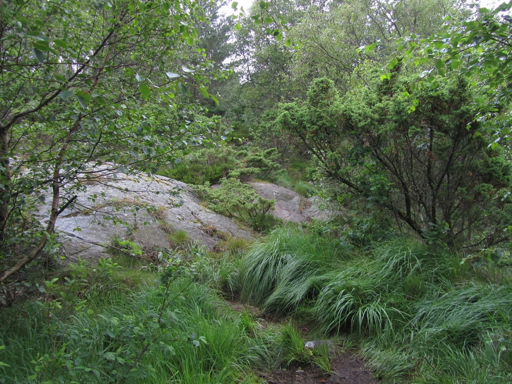 Der nächste Tag ist leider von Regen bestimmt. Wir müssen ja sagen, glücklicherweise hatten wir sehr wenig komplette Regentage, aber dieser war einer. So fuhren wir gemütlich mit Tee- und Schlafpausen in Richtung Kap Lindesness, wo uns, neben einem idyllischen Campingplatz mit Mini-Fischerhafen, der älteste Leuchtturm Norwegens erwartet. Da wir trotz des wechselhaften Wetters bislang immer das Glück hatten, unsere Wanderungen bei sehr gutem Wetter gemacht zu haben und noch keine Wanderung im Regen, entschieden wir am nächsten Morgen, dass es jetzt doch mal an der Zeit wäre und machen uns trotz Nieselregen zu Fuß auf den Weg zum Leuchtturm, dem südlichsten Festlandpunkt Norwegens. Die Tour war ausgesprochen abwechslungsreich, durch Wald, an einem idyllischen See vorbei, über eine durch den Regen „quietsche-nasse“ Sumpflandschaft, vorbei an einzelnen Häusern. Zum Schluss stellte sich heraus, dass es doch 9,5 km waren – dank Pauls GPS-Gerät wussten wir, dass wir damit wieder eine gute Trainingseinheit gemacht haben.