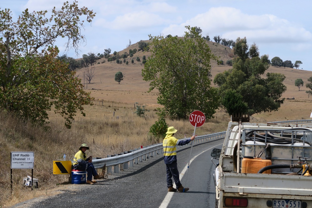Hier erstmal eine typische Baustelle im weiten Bushland unterwegs, dann zwei Fotos vom Bushland und im Anschluss der See, Lake Hume: